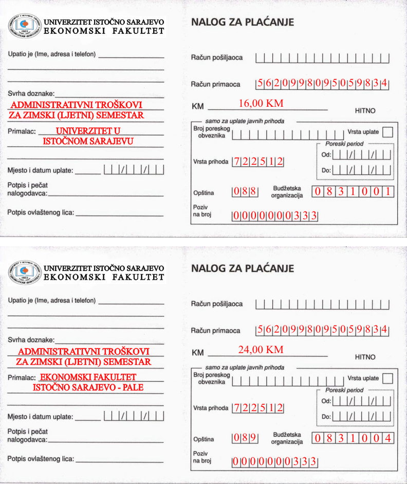 Uplatnice za administrativne troškove (plaćaju svi studenti – budžet i sufinansirajući)