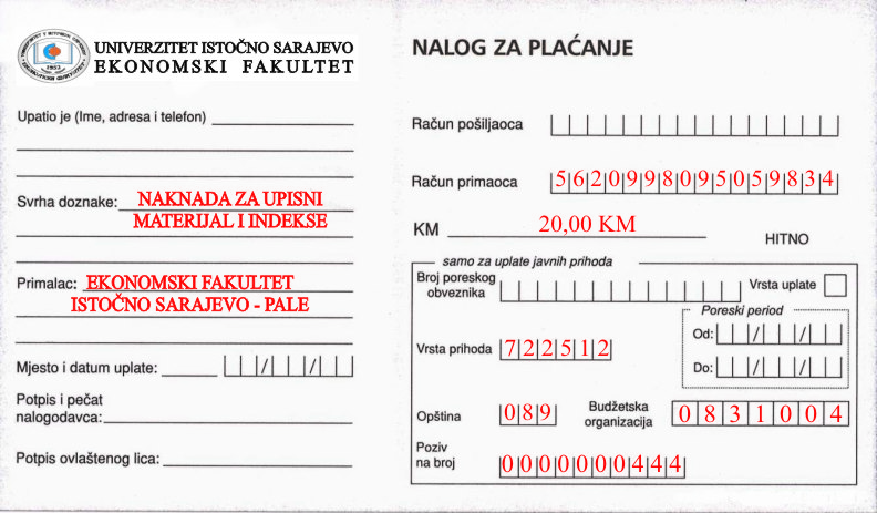 Uplatnica za indeks i obrasce (plaćaju svi studenti – budžet i sufinansirajući)