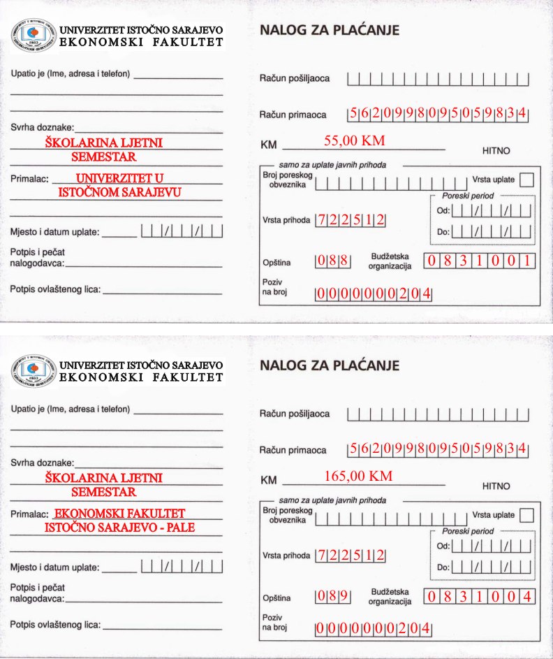 - upis za semestar (2.,4.,6. i 8.) ……………………………………………………40,00 KM