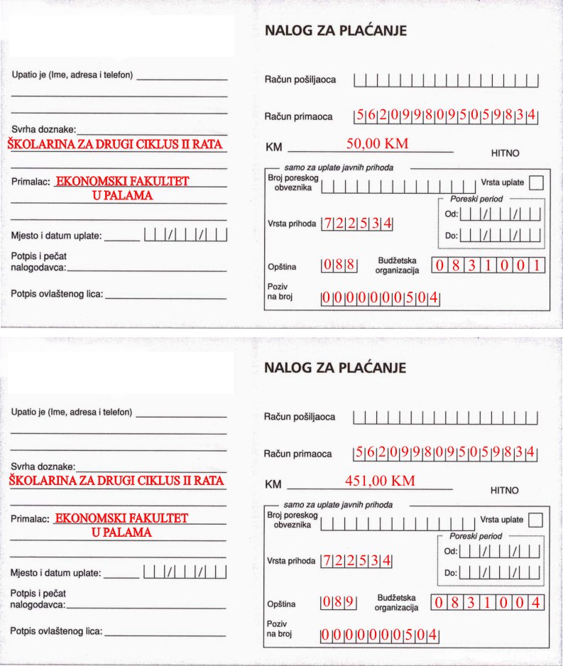 Uplatu za drugu ratu studenti su dužni obaviti u terminu od 01.06.2012. do 15.06.2012. godine (od 09,00 do 12,00 časova).