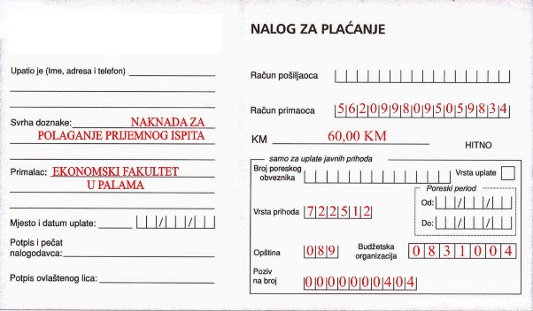 - dokaz o uplati naknade za polaganje prijemnog ispita
